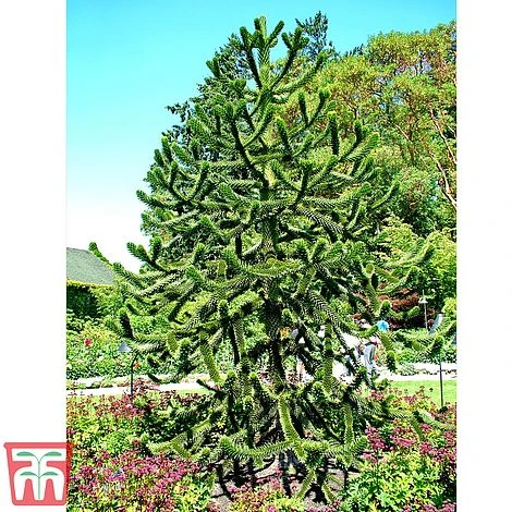 This majestic conifer is instantly recognizable as the Monkey Puzzle Tree. A stately evergreen conifer with a very distinctive upright, branching habit that makes this such a striking specimen plant. The near-horizontal branches are cloaked in triangular scale-like foliage and decorated with green-yellow cones in summer. Araucaria araucana is a stately tree at maturity, reaching towering heights. Give it plenty of space to create a shapely specimen that will always attract attention! Height: 12m (39’). Spread: 8m (26’).