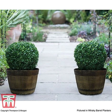 Add some style to doorways, gates and paths! A pair of carefully positioned Box balls are the perfect way to create an elegant entranceway. These neatly clipped evergreen shrubs make a great feature planted in terracotta pots, adding formality, structure and year round interest to your garden. Buxus sempervirens is well known for its neatly clipped appearance and slow growth rate which makes it conveniently low maintenance. Supplied as 28cm (11″) diameter ball in a 23cm pot. Grows up to 3m (9’) if left unpruned.
