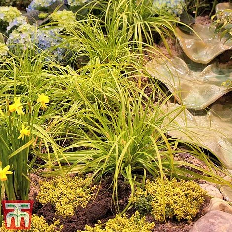 Carex oshimensis ‘Everillo’ forms spectacular evergreen clumps with a lax, cascading habit. The foliage of this perennial grass is chartreuse green fading to pale gold at the tip of each blade. This vibrant display is enhanced by small, somewhat insignificant, brown flower spikes in late Spring. With its loose, arching growth, this perennial grass is ideal for pouring over the edges of patio containers and edging raised beds and borders. Height and spread: 40cm (16″).