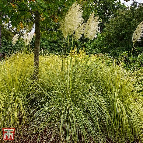 Cortaderia selloana ‘Gold Minipampas’ is a dwarf variety of the well-known, majestic Pampas Grass. Its compact habit makes this a much more realistic choice for the average garden border! This hardy, evergreen grass boasts stiff, narrow foliage, striped in green and gold, which provides valuable texture and structure in the garden, all year round. From August, it sends up flower heads in a mass of fluffy plumes. Perfect for sunny borders and large containers where it makes a superb focal point. Height and spread: 100cm (39″).