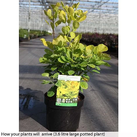 A golden smoke bush that will light up summer borders with its bright yellow, oval shaped foliage. Cotinus coggygria ‘Golden Spirit’ bears frothy plumes of subtle green flowers from midsummer, before the cool chill of autumn sets the foliage ablaze with vibrant shades of orange and red. Cotinus ‘Golden Spirit’ is easy to grow and holds an RHS AGM for its excellent garden performance. This hardy deciduous shrub makes a superb specimen plant or focal point for the back of a sunny border. Height and spread: 5m (16’).