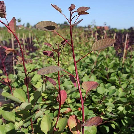 Grown for its fabulous coloured foliage, the smoke bush is a well known sight in UK gardens. Cotinus coggygria is a large, deciduous shrub with deep purple leaves that turn to vibrant hues of red and orange in autumn. In summer the frothy plumes of cream flowers surround the plant with a soft, smoky appearance. Hardy, and easy to grow, the smoke bush is often seen in cottage gardens, and its cut stems make a great addition to flower arrangements. Height and spread: 5m (16’).