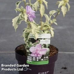 Hibiscus syriacus ‘Summer Ruffle’ not only delivers weeks of showy lilac flowers from mid-summer to autumn but also has attractive variegated foliage with creamy white margins, providing interest for an even longer season. Exotic-looking, but a cinch to grow, it makes a glamorous feature shrub for a patio pot or border, providing colour late in the season when other plants are looking tired. It looks equally at home in a cottage garden scheme or a tropical-themed border. The flowers attract a wealth of beneficial pollinators. Drought tolerant once established. Height: 150-200cm (59-78in). Spread: 100cm (39in).