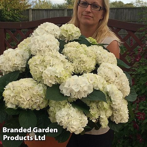 Hydrangea macrophylla ‘White’ produces strong stems clothed in bright green, toothed leaves and pure white flower heads from June to September. The skeletal seedheads persist long after the flowers have faded, providing continuous interest right through to winter. Height: 2m (6.5ft). Spread: 2.5m (8.2ft).