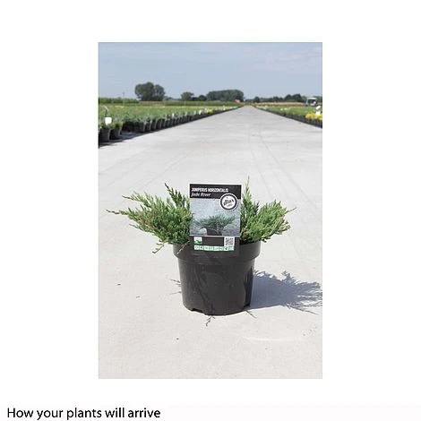 The silver-blue foliage of Juniperus horizontalis ‘Jade River’ has a delightfully feathered appearance, forming a dense carpet of evergreen colour. During the coldest winters it takes on an attractive rich purple hue. This low growing, prostrate conifer tolerates most growing conditions, from dry soils to coastal positions, needing no maintenance once established. Creeping Juniper makes fabulous groundcover for conifer beds and borders, or can be grown as an individual specimen plant. Height: 15cm (6″). Spread: 2m (6′).