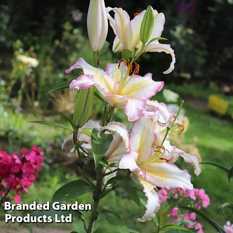 The tropical blooms of Lily ‘Primrose Hill’ are simply breath-taking! Enormous, gleaming white flowers are streaked with pale gold, each petal boasting a pale lilac edge. This tall tree lily makes a majestic focal point in the garden – its thick stems reaching up to 120cm (71”) with maturity. This towering Oriental Lily is best enjoyed in the garden where it will attract pollinating insects. Plant it in borders as a showy focal point, or grown en masse as a floral screen around the patio where its perfume will fill the air. Height: 180cm (71”). Spread: 45cm (18”).