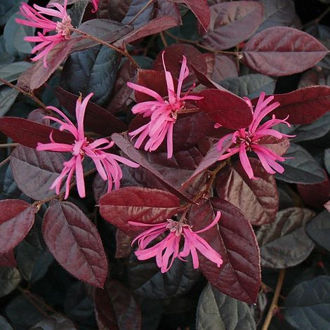 Rarely seen in gardens, this handsome spreading shrub deserves to be much better known. Evergreen purple-bronze foliage provides fabulous year round colour, and contrasts beautifully with the spidery, raspberry-red spring blooms. The flowers of Loropetalum chinense var. rubrum ‘Fire Dance’ are delicately scented, which only adds to its charms. This magnificent hardy shrub is ideal for sheltered borders and woodland gardens where it makes an eye catching specimen in spring and provides a beautiful backdrop for colourful summer perennials. Height and spread: 2m (79″).