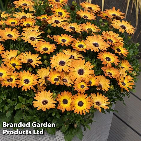 - Osteospermum ‘Purple Sun’ – multi-award winning African Daisy. Extraordinary bi-coloured blooms featuring a central halo of glowing purple which merges into tangerine orange. Height: 30cm (12″). Spread: 45cm (18″).