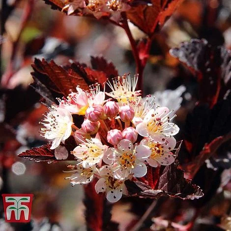 Physocarpus opulifolius ‘Summer Wine’ is a compact, hardy and deciduous shrub that is easy to grow in almost any part of the garden. Deep burgundy, wine coloured leaves densely smother this architechtural plant, turning bronze in autumn before they fall to the ground to reveal the characteristic flaking bark of this variety. Ninebark, as it is commonly known, produces clusters of small white flowers along its stems during the summer which contrast nicely with the foliage. An ideal plant as a backdrop to flower borders, or as part of a shrub collection of any size where it will certainly hold its own! Height: 150cm (59″). Spread: 150cm (59″).